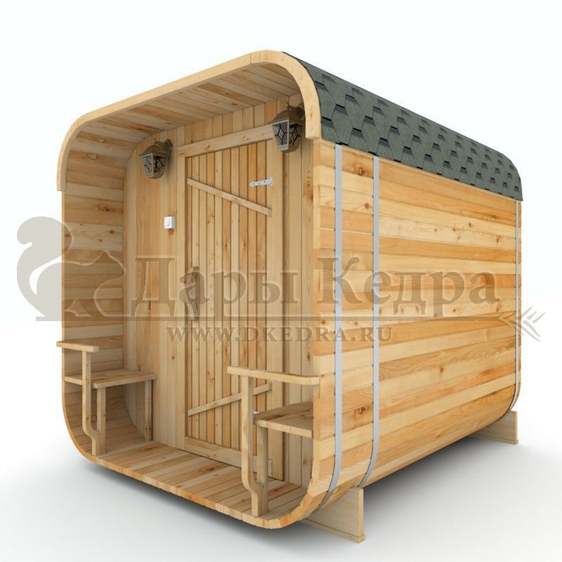 Симбиоз круглой и квадратной бани-бочки. Разработано с учётом эргономики, в ней так же просторно, как и в квадро-бочке, но при этом полукруглая крыша не дает задерживаться снегу и влаге на кровле. А еще такая баня безусловно красивая, мобильная и доступная каждому!