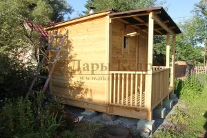 Это классическая прямоугольная модель бани с двумя отделениями: парилкой и раздевалкой. Для удобства пользования раздевалка оснащена лавочкой и вешалкой. Парилка оборудована двухуровневым открытым полком и печью. За счет небольшой конструкции баня нагревается в течении 30 минут. Ее можно заказать как в готовом, так и в разборном варианте. В разборной модели готовые щиты из кедра быстро собираются в полноценное строение, что также позволяет исключить лишний строительный мусор. Каркасно-щитовая баня не требует полноценный фундамент, поэтому при необходимости ее можно перенести в другое место.