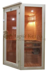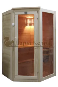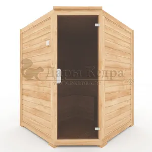 Это специально оборудованная деревянная кабина для сухого и влажного парения. Электропечь нагревает пространство внутри и позволяет сбрызгивать камни водой, слегка увлажняя воздух. Такая процедура позволяет избежать перегрева. Сауна обшита снаружи и внутри вагонкой из липы и имеет теплоизоляционный слой. Установка сауны в угол позволяет рационально использовать пространство помещения. Финская сауна с электропечью подойдет как для домашнего использования, так и для коммерции. Доставляется в разборном виде щитами, собирается по инструкции с помощью шуруповёрта.