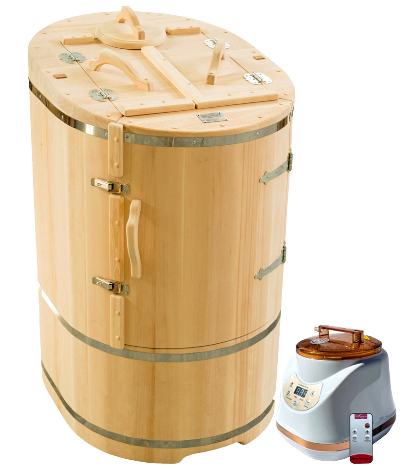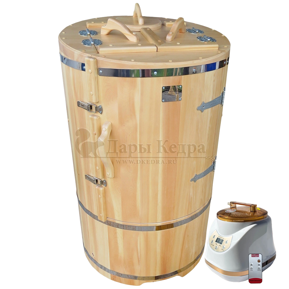 • Готовый комплект «Доступный»: кедровая бочка с парогенератором Готовый комплект - это полностью укомплектованный набор с фитобочкой для процедур парения. Круглая модель наиболее компактна и мобильна. Толщина стенок составляет 25 мм. Фитобочка оборудована откидными створками, дверцей и отверстием для головы. Во время парения человек сидит внутри кедровой бочки, а голова находится снаружи. Благодаря этому исключается возможность перегрева. Подлокотники из кедра, встроенные ручки на створках и двери делают эксплуатацию более удобной. Парение в фитобочке благотворно влияет на организм в целом: повышается иммунитет, выводятся шлаки и токсины, улучшается работа органов тела и состояние кожи.