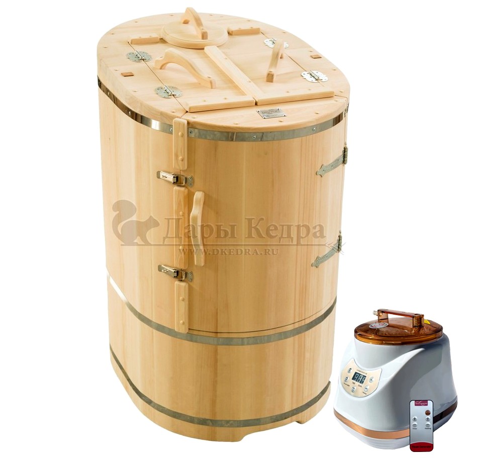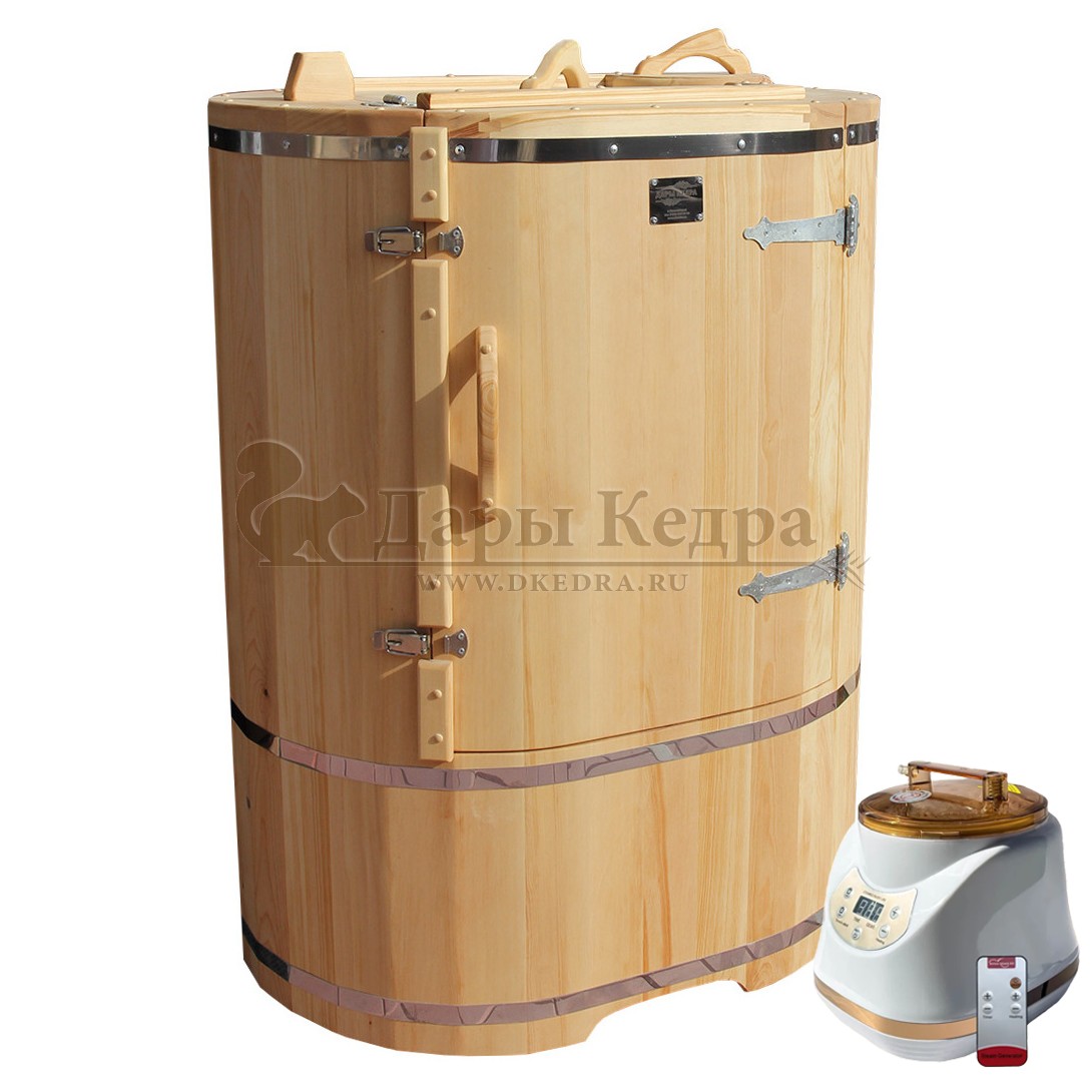 • Готовый комплект «Удобный»: кедровая бочка с парогенератором + био-защита изнутри и снаружи Готовый комплект - это полностью укомплектованный набор с фитобочкой для процедур парения. Овальная модель более просторна и удобна в использовании. Толщина стенок составляет 25 мм. Фитобочка оборудована откидными створками, дверцей и отверстием для головы. Во время парения человек сидит внутри кедровой бочки, а голова находится снаружи. Благодаря этому исключается возможность перегрева. Подлокотники из кедра, встроенные ручки на створках и двери делают эксплуатацию более удобной. Парение в фитобочке благотворно влияет на организм в целом: повышается иммунитет, выводятся шлаки и токсины, улучшается работа органов тела и состояние кожи.