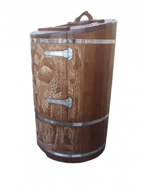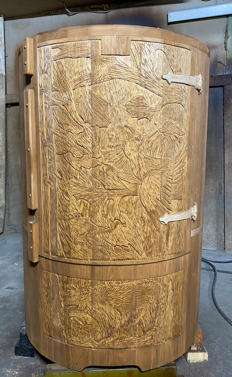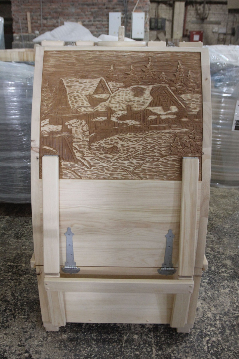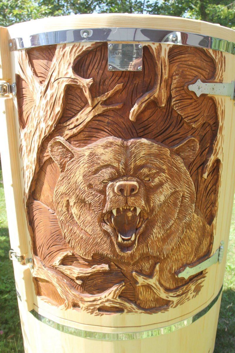 Резьба на дверце кедровой бочки (габаритные фитобочки)