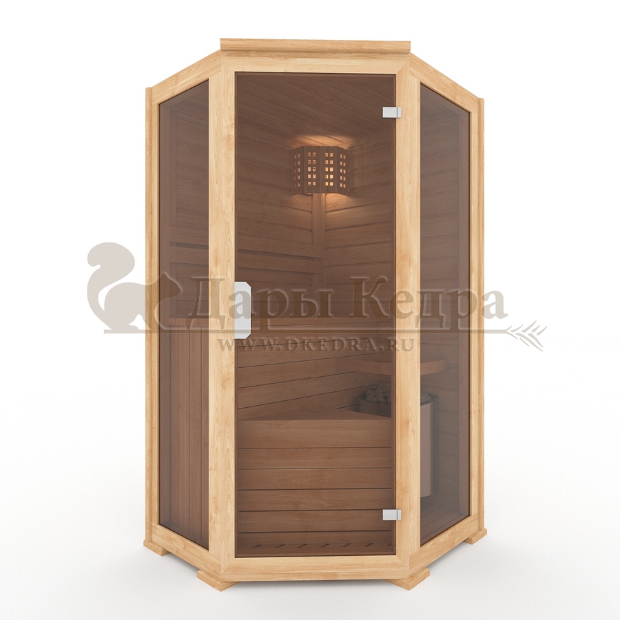 Одноместная угловая финская сауна кабина из кедра с электрокаменкой Это специально оборудованная деревянная кабина для сухого и влажного парения. Электропечь нагревает пространство внутри и позволяет сбрызгивать камни водой, слегка увлажняя воздух. Такая процедура позволяет избежать перегрева. Двойные стенки кабины с теплоизоляционным материалом удерживают тепло. Установка сауны в угол позволяет рационально использовать пространство помещения. Финская сауна с электропечью подойдет как для домашнего использования, так и для коммерции. Доставляется в разборном виде щитами, собирается по инструкции с помощью шуруповёрта. Обращаем Ваше внимание, что в стоимость сауны уже включена дверь с закаленным стеклом в раме из кедра с фиксатором и деревянным фасадом. Вы можете заменить фасад на цельностеклянный с безрамной дверью за дополнительную плату. Нагреваясь, древесина кедра выделяет полезные вещества-фитонциды, которые благотворно влияют на организм в целом и укрепляют иммунитет.
