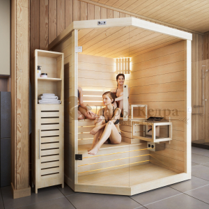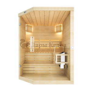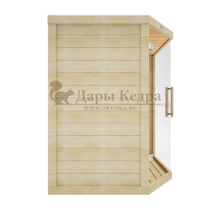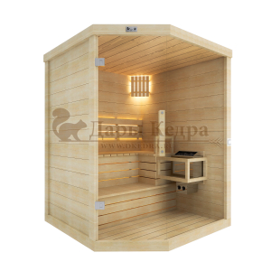 Это специально оборудованная готовая деревянная кабина для сухого и влажного парения. Электропечь нагревает пространство внутри и позволяет сбрызгивать камни водой, слегка увлажняя воздух. Такая процедура позволяет избежать перегрева. Каркас сауны выполнен из массива кедра, снаружи и внутри обшит липовой вагонкой сорта «Экстра» и имеет теплоизоляционный слой. Также двухуровневый полок идёт из кедра для обогащения внутри кабины полезными фитонцидами, а в сочетании с противовирусными свойствами липы сауна становится настоящим источником здоровья.