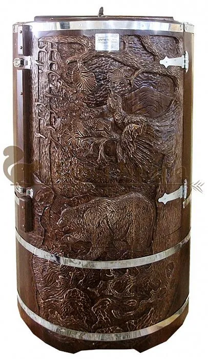 И, конечно, стоит отметить мастеров компании, осуществляющих профессиональную резьбу на древесине фитобочки или купели. Изделие с художественным оформлением - это выбор ценителей красоты, индивидуальности, эко-стиля. Бочка с резьбой станет объектом всеобщего внимания. Можно выполнить тонирование рисунка или окрашивание всей бочки в круговую и выделение рисунка сделать отдельно с помощью осветления. Таким образом, более светлый контур резьбы будет смотреться очень ярко на темной фитобочке. Все работы по художественному оформлению проводятся мастерами вручную, никаких станков!